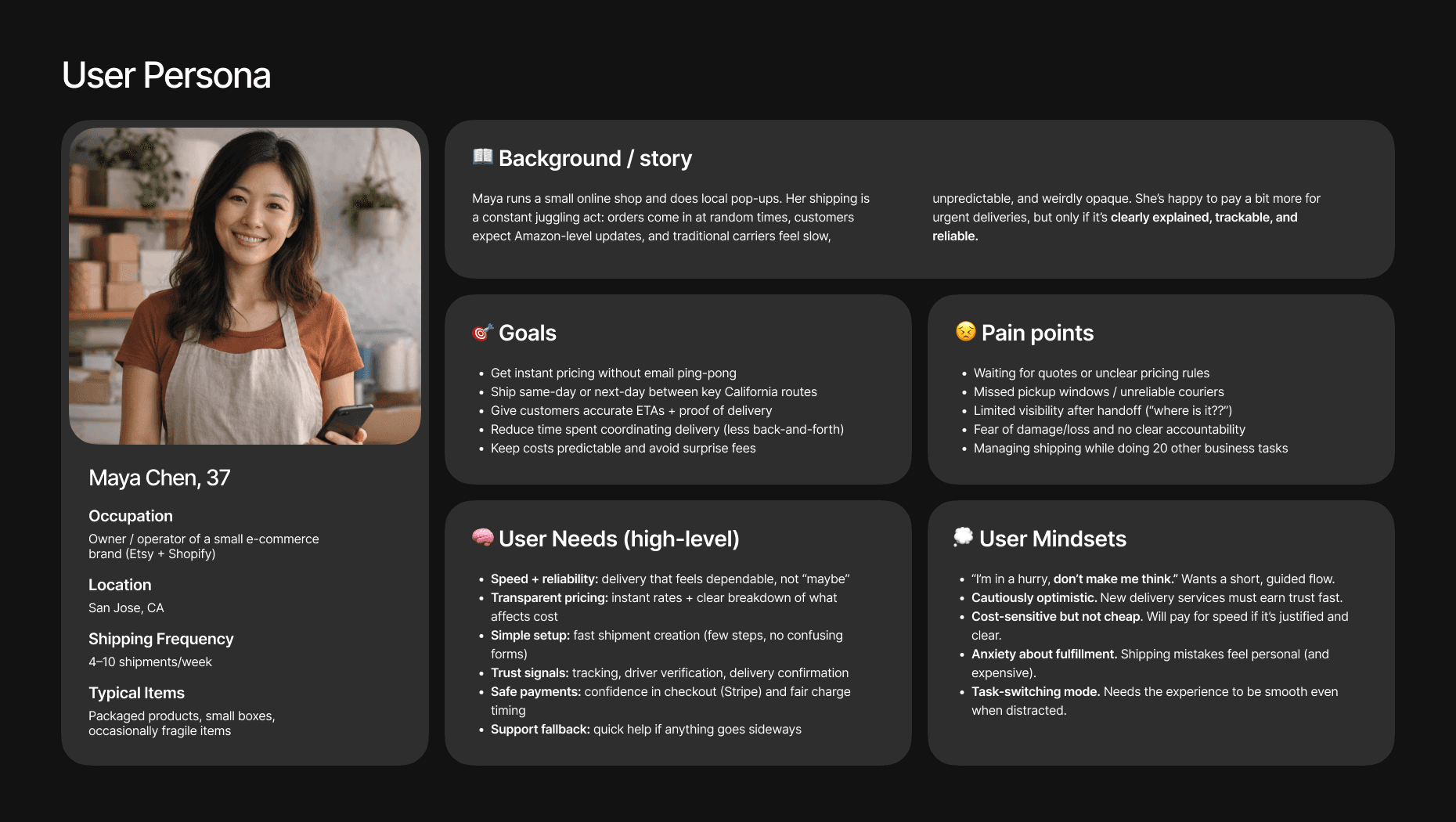 To identify the pain points and opportunities, I conducted: • 5 user interviews with small business owners and independent sellers • Competitive analysis of four leading shipping platforms • Journey mapping to visualize pain points and redundancies