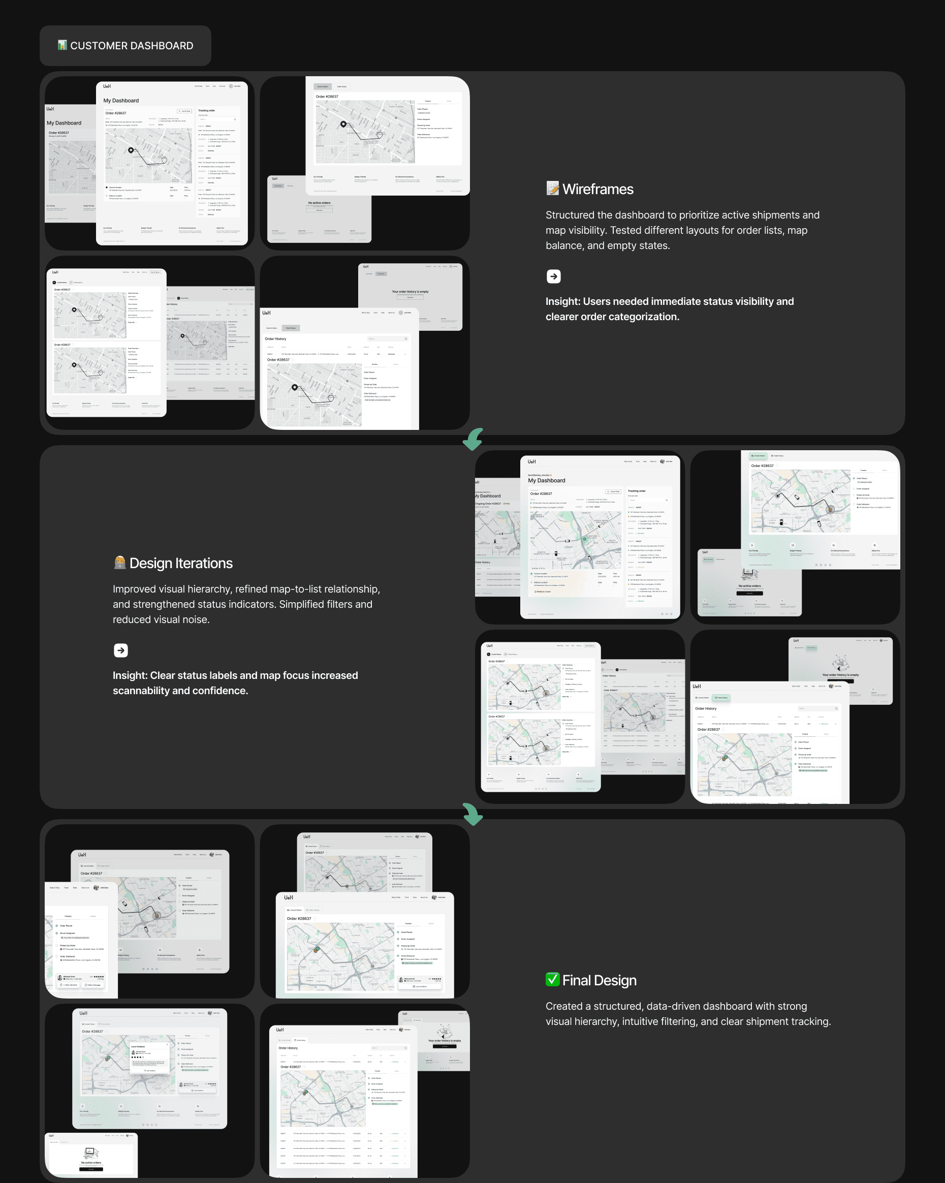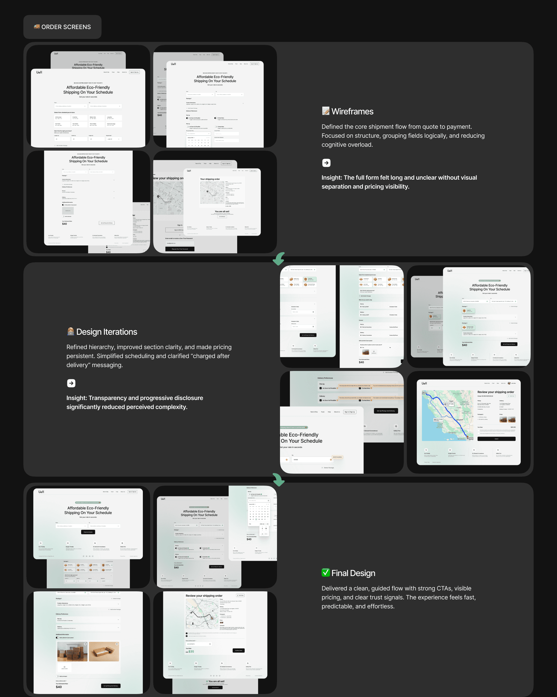 Before 🔻 Multiple disconnected steps without clear guidance 🔻 Confusing pricing estimates and inconsistent feedback 🔻 Poor mobile experience due to non-responsive layouts 🔻 High drop-off rates during shipment creation After ❇️ Guided, step-by-step flow from quote to tracking ❇️ Real-time feedback with transparent cost breakdowns ❇️ Unified responsive design that works seamlessly across devices ❇️ Reduced friction, leading to faster task completion and improved confidence